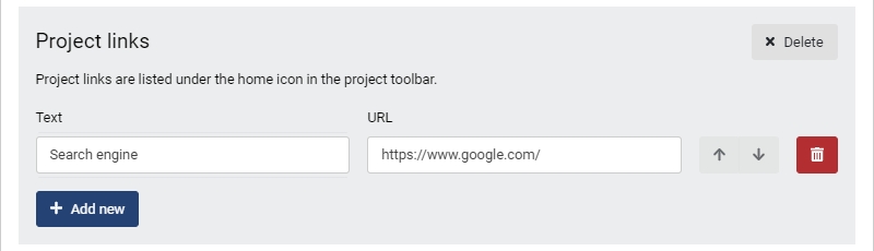 Text field defines the name that is displayed in the Project link -menu later on. Text can be changed at any point.