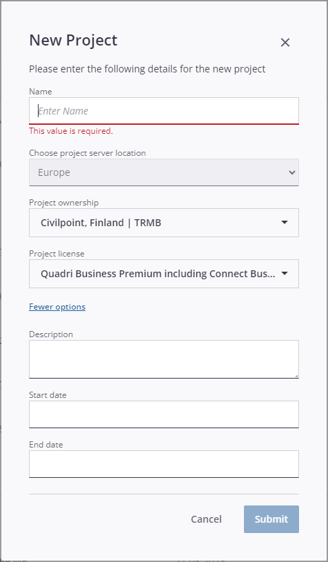 Name, server location, project ownership and project license are the mandatory fields. After naming the project, other mandatory fields can be edited (if there are other alternatives available).&#x20;