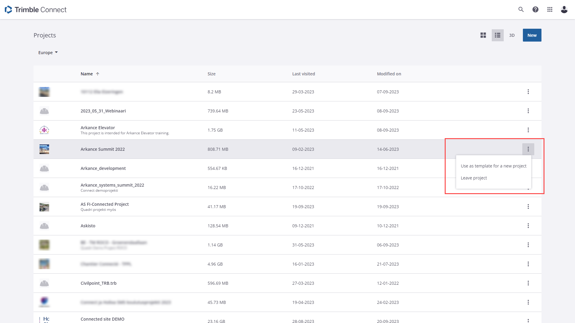 Access [web.connect.trimble.com ](https://web.connect.trimble.com)and after successful sign in, choose the template project, from the project view and click the three dots, next to the project name.&#x20;