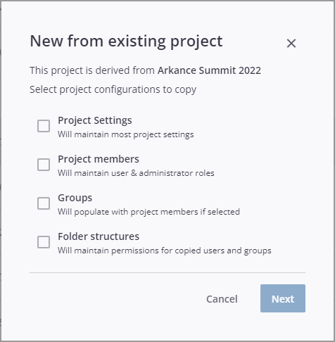 Second option is to create a new project based on a template project. This option allows user to use a folder structure and user groups from an existing project. Also, the project settings can be copied from the same template project.