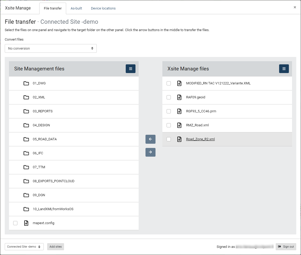 Notice that on the top of the dialog there are two tabs; File transfer and As-built.