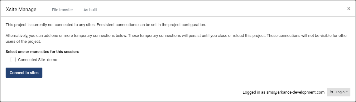 Select one or more sites for the session by activating the checkbox in front of the site. If the list is missing projects, please make sure that user has access to the site in Xsite Manage. The list only consists of sites that the logged in user has access to.