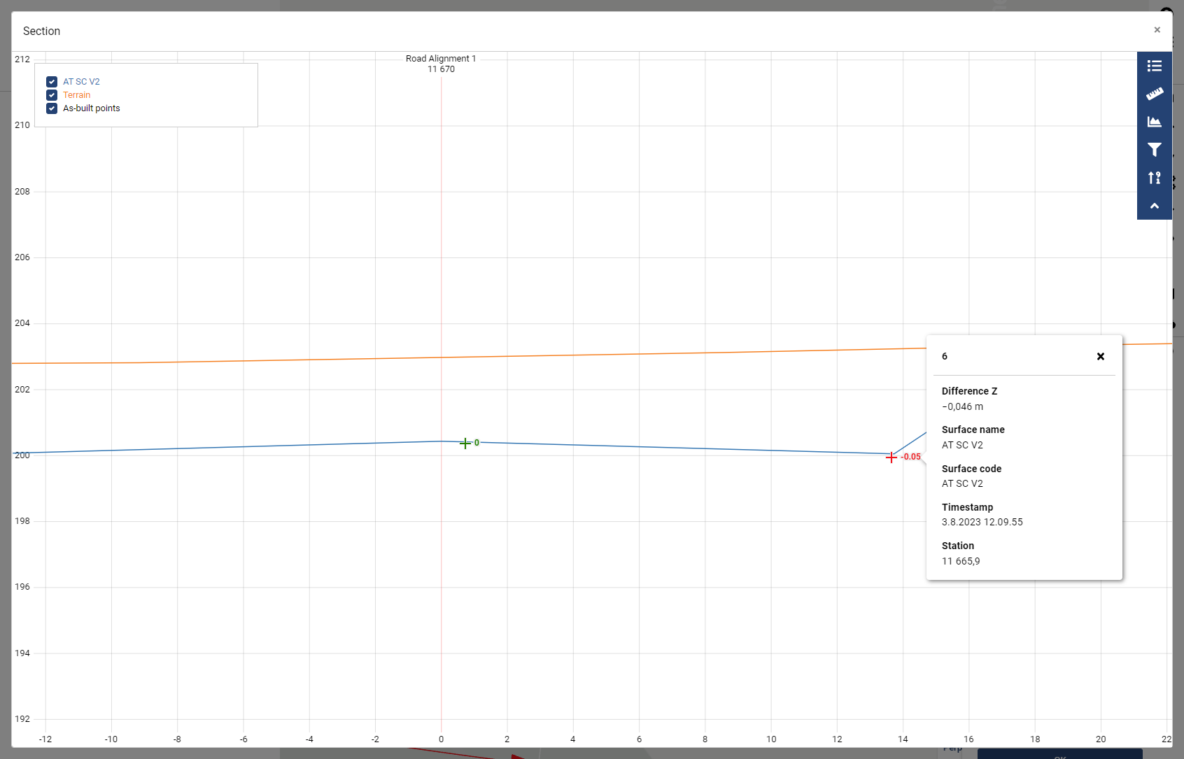 The same as-built points can be viewed in the section tool. There is an additional information when using the section tool. Station defines at which station on this alignment the point is located. This allows user to navigate to the right section and see why point is outside of the tolerance.