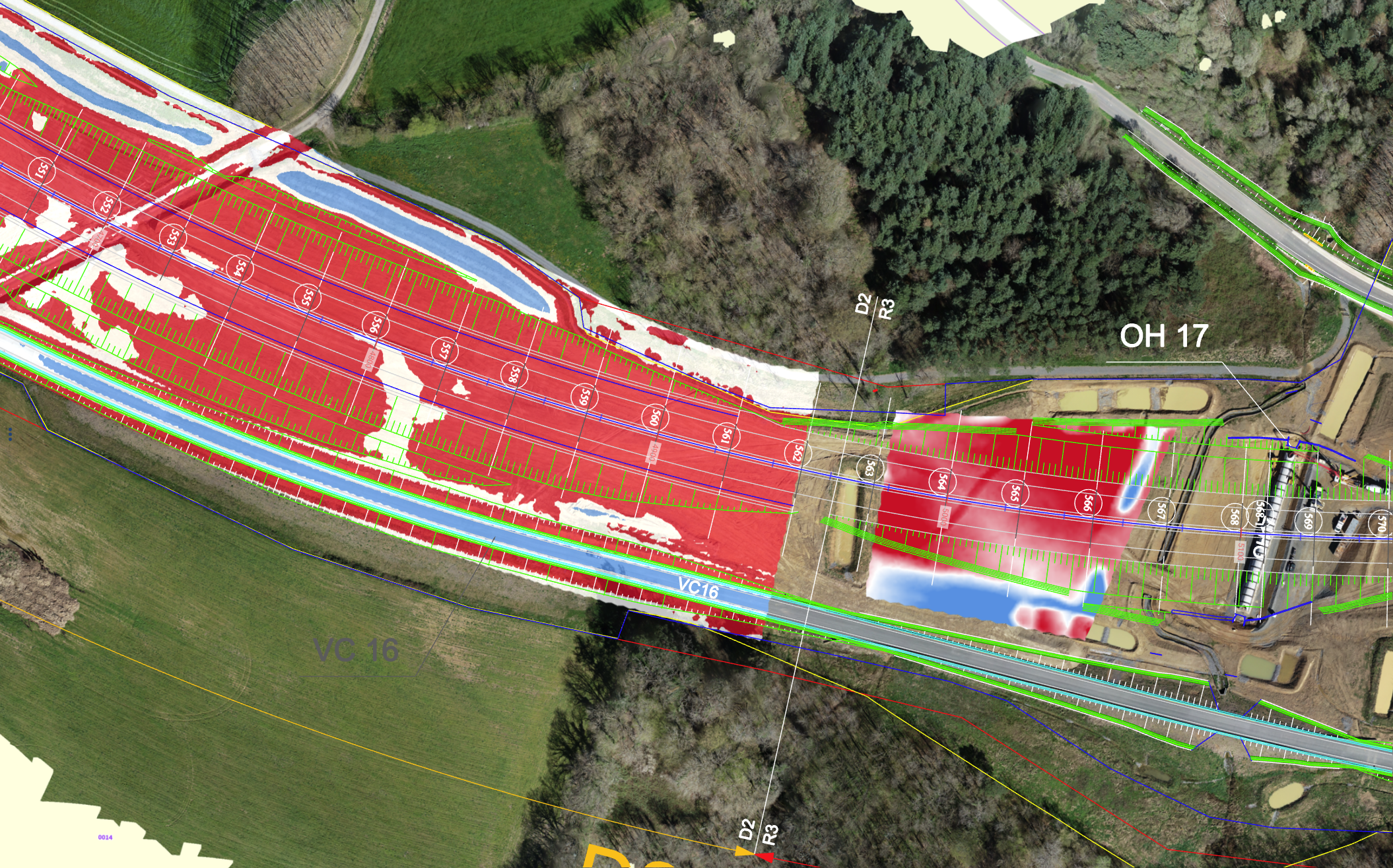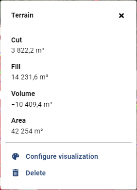 The Volume -value is calculated by subtracting Fill -value from the Cut -value. If the value is negative, it means that there is need for material in this area. If the value is positive, it means that there are excess material.