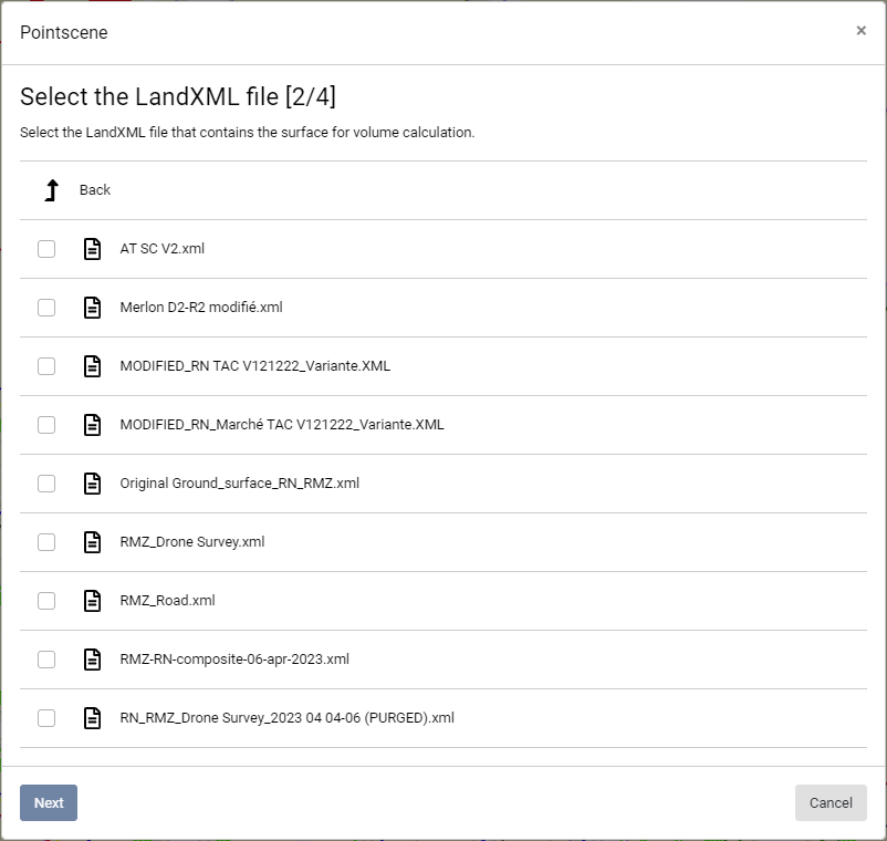 Browse the folder structure, locate and select the LandXML -file containing the surface, which is used for the volume calculation.&#x20;