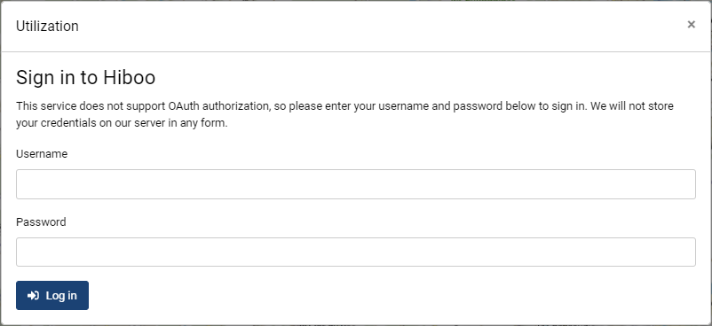 This opens a sign in menu. The username and password that are being prompted, belong to Hiboo solution. Use those credentials to sign in.