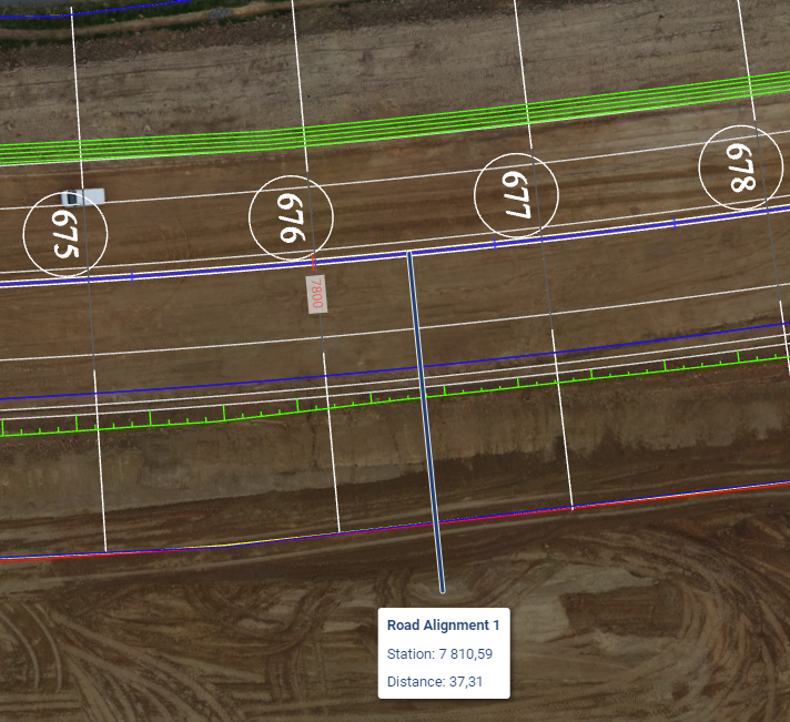 Once a location is clicked, Site Management calculates the distance to that specific point perpendiculary from the alignment. As a result the tooltip will present the name of the alignment, station that the wanted location is on and distance from the alignment to that point.