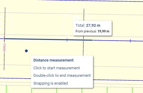 To measure, click on location where the measurement starts and click on the next location. Double-click while using the tool will end the current measurement, but the tool stays active. The picture below shows distance measurement -tool tip and the actual measurements.&#x20;