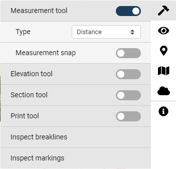 Activating the measurement tool, click on the "**Measurement tool**" slider and select the wanted type. Measurement snap -option allows the tool to be snapped on LandXML elements.&#x20;