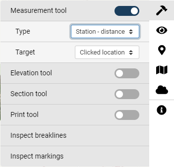 <figure><img src="https://content.gitbook.com/content/5BpwPICy7UBlDgnb7FKH/blobs/UW8EYMZ9yKv7qwibgAkX/Tools_1_Measurement_tool_station.png" alt=""><figcaption><p>Station - distance -option in Measurement tool</p></figcaption></figure>