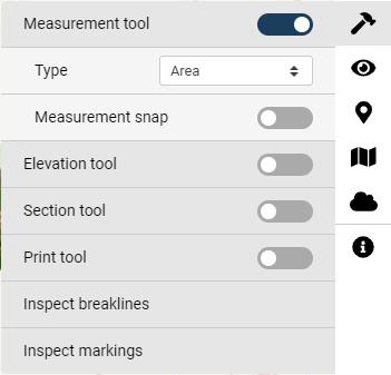 <figure><img src="https://content.gitbook.com/content/5BpwPICy7UBlDgnb7FKH/blobs/XtzAIcxSAXLuFVpGpVbB/Tools_1_Measurement_tool_area.png" alt=""><figcaption><p>Area -option in Measurement tool</p></figcaption></figure>