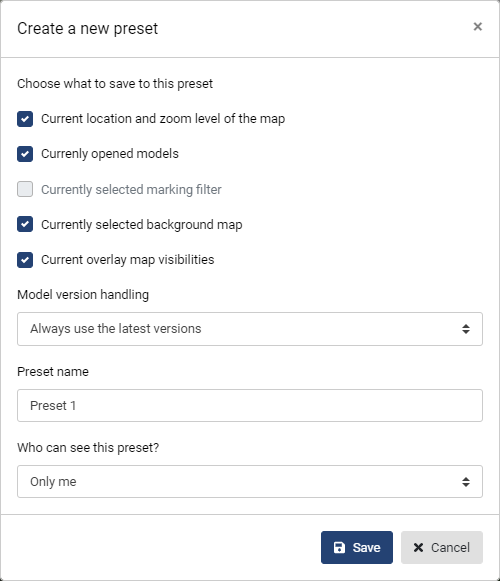 Model version handling -dropdown list has two alternatives; Always use the latest versions and Keep the current versions. This means that if a file is revisioned, will the preset use the latest version or the one that was available when preset was created.
