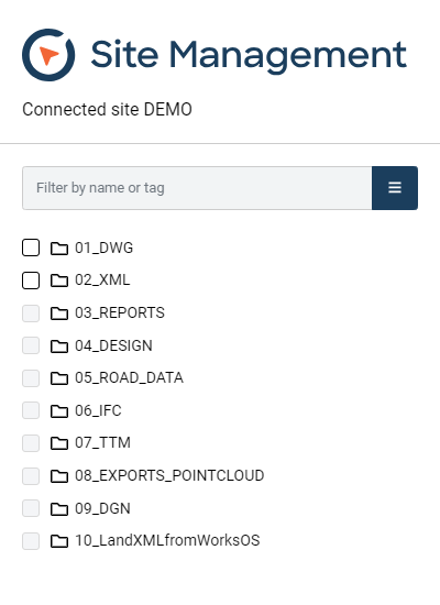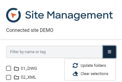 Behind the three bars, user can either clear selection or update folders. If files have been added from the background storage (ACC or Trimble Connect), user must update folders before the files are visible in Site Management.