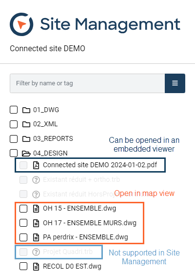 Please note that Site Management can display LandXML, DWG, DGN, DXF, IFC and geonic -file formats on the map.