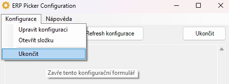 Příkaz se nachází v nabídce Konfigurace dialogového okna ERP Picker Configuration. Po spuštění zavře dialogové okno nastavení Holixa ERP Pickeru.