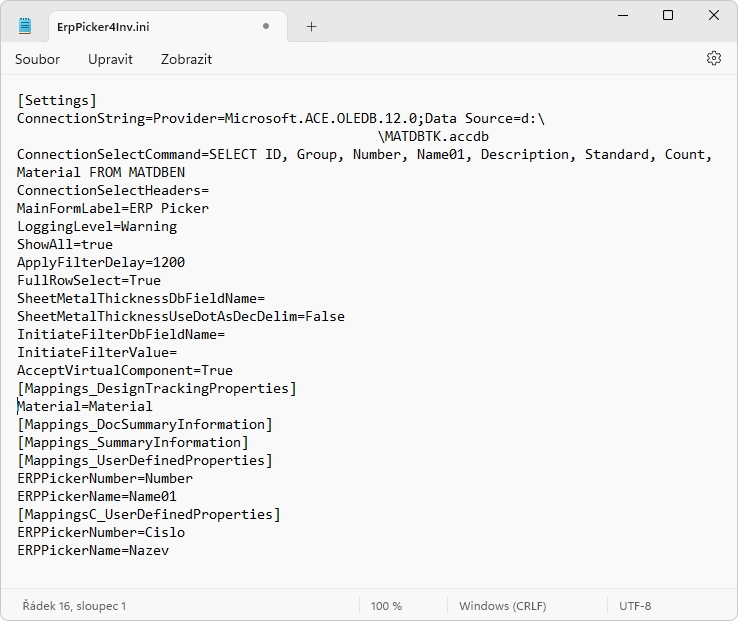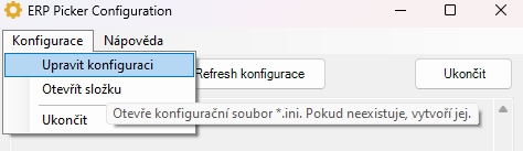 Příkaz se nachází v nabídce Konfigurace dialogového okna ERP Picker Configuration. Po spuštění otevře konfigurační INI soubor, který je tak možné upravit. Pokud INI soubor neexistuje, je vytvořen nový s výchozími hodnotami.