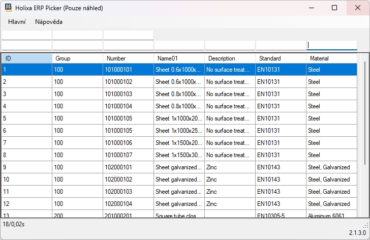 Holixa ERP Picker App je samostatně spustitelná aplikace nezávislá na aplikaci Autodesk Inventor. Umožňuje zobrazit tabulku dat z nakonfigurovaného datového zdroje a tato data exportovat do CSV souboru.