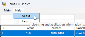 The command is located in the Help menu of the Holixa ERP Picker dialog box. When run, it displays a dialog box with information about the license status.