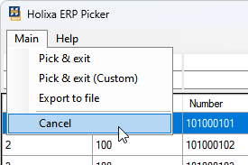 The command is located in the `Main` menu of the Holixa ERP Picker dialog box. When executed, it closes the Holixa ERP Picker window. No values will be written to the iProperties.