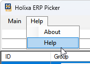The command is located in the `Help` menu of the Holixa ERP Picker dialog box. When executed, it opens a web browser window with online help.