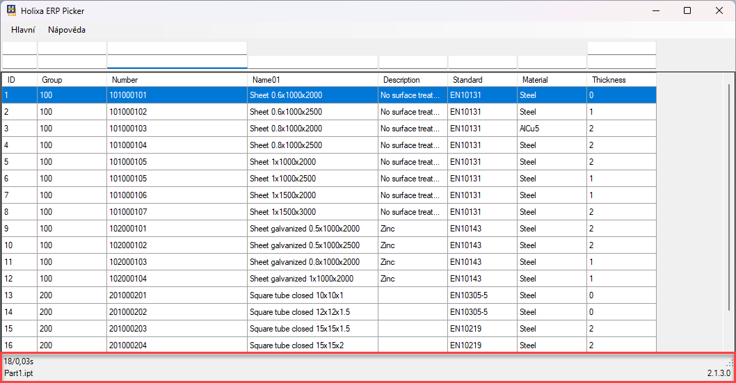 Additional information about the data retrieved from the database, the Inventor document, and the application version is displayed at the bottom of the main Holixa ERP Picker window.