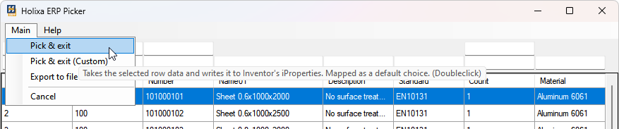 The command is located in the `Main` menu of the Holixa ERP Picker dialog box. When executed, it will write the required attributes from the database (from the selected row) to the Inventor iProperties file.