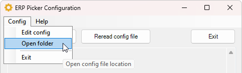 The command is located in the `Configuration` menu of the ERP Picker Configuration dialog box. When run, it opens a folder with the location of the configuration INI file.