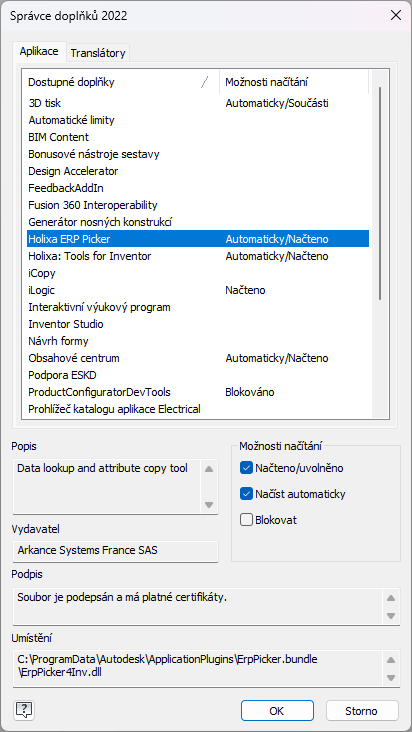 In rare cases, if you get a message about blocking the add-in in Inventor, go to `Tools -> Add-ins`, find Holixa: *ERP Picker* and check the options *Load automatically* and *Loaded/released*.