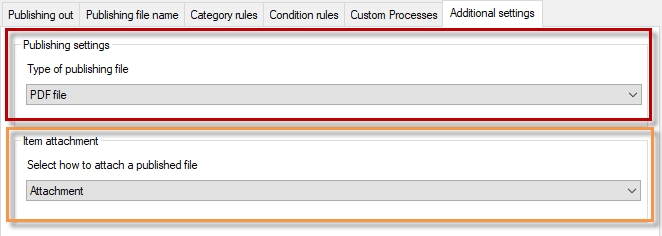Ve specifické nastavení modulu EPLANu se nastavuje jaký typ souboru se má publikovat a v případě publikace z entity Položka ještě specifikovat vazbu mezi kopírovaným souborem a položkou.