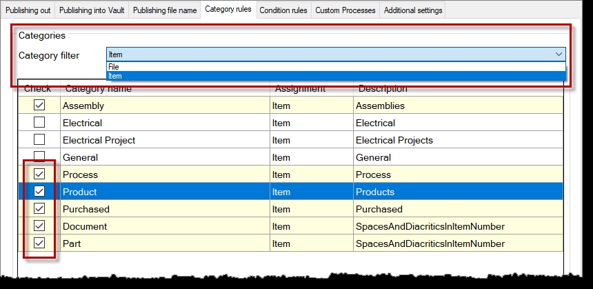 Pokud je zdrojová publikační entita typu položka, dochází ke kontrole povolených kategorií hierarchicky – tj. nejdříve dojde ke kontrole kategorie na položce a následně ke kontrole kategorie připojeného souboru. Pokud tedy položka obsahuje např. více výkresů (výrobní, montážní, …) lze tímto nastavením specifikovat, kam a jak se má publikovat např. jen jeden výkres.