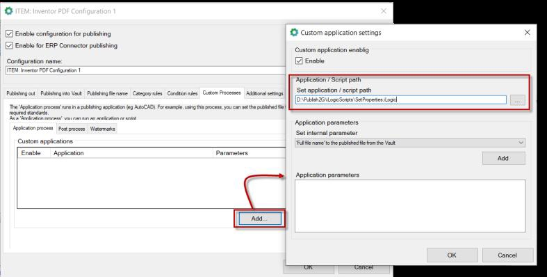 Aplikační procesy slouží ke spuštění skriptu nebo příkazu v publikační aplikaci ještě před vlastní publikací. Lze tak např. na výsledný step aplikovat ještě pravidlo, které např. vyplní firemní vlastnosti nebo provede obarvení, zjednodušení apod. Podporované publikační aplikace pro spuštění jsou Inventor a AutoCAD.