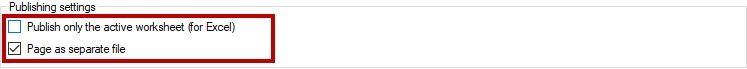 Specifické nastavení publikace dokumentů MS Office do PDF se týká pouze souborů Excelu a lze nastavit omezení publikace jen na aktuální list, tj. list, který byl nastavený jako aktivní při uzavření souboru. Volbou „Strany jako samostatný soubor“ lze nastavit, že pro každou stranu bude vytvořený samostatný PDF soubor.
