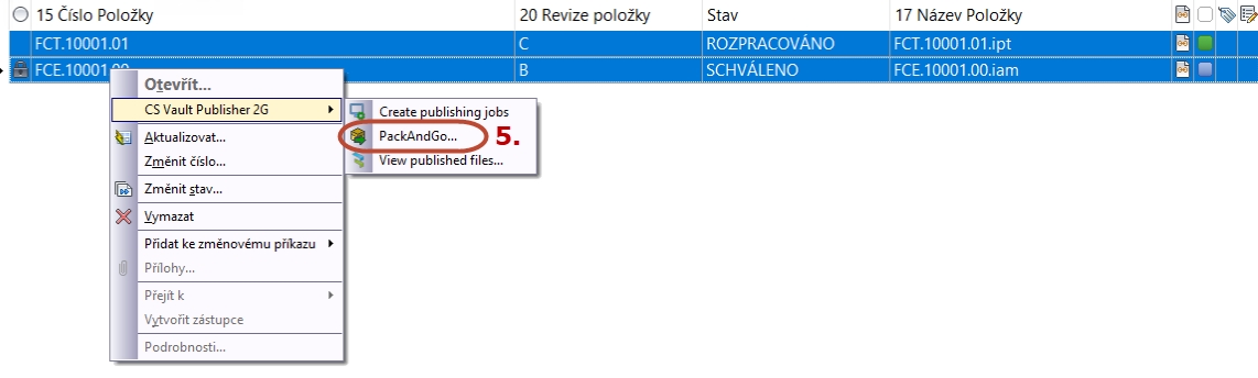 Příkaz PackAndGo lze vyvolat nad uloženým výběrem položek pravým tlačítkem z menu Vault Publisheru.