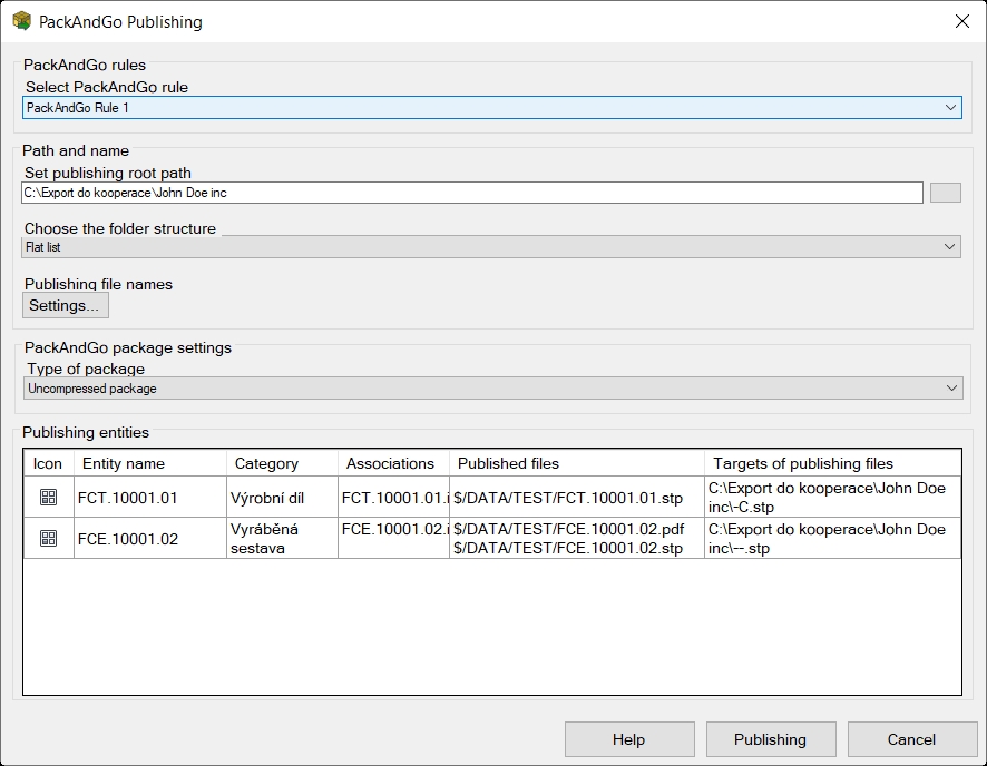 Pokud se provádí Pack And Go publikace často se stejným nastavením, lze nastavit pravidla (zatím jen globálně). Ty jsou pak zobrazena ve výběru „PackAndGo rules“