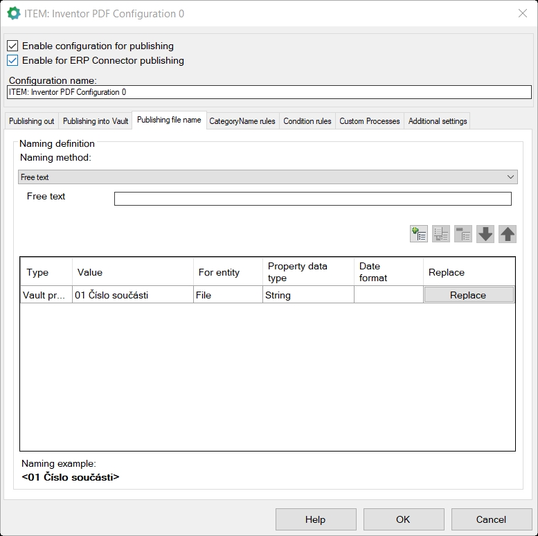 Pojmenování souboru lze provést nezávisle na již publikovaných datech. Klasicky je nastavena vlastnost „Číslo součásti“, jako hlavní jméno publikovaných dat ve Vaultu. Je použito z důvodu jednoduchého přepsání a odpojení již publikované dokumentace při odschvalování a schvalování CAD dokumentace.