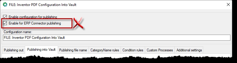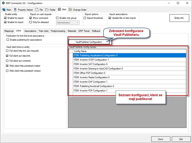 Nastavení toho, co se má publikovat přes EC a zapsat do tabulky EC se nyní zapisuje do konfigurace EC. Do seznamu v EC se zapisují jména konfigurací Vault Publisheru (konfigurace ve Vault Publisheru musí mít jedinečný název, související oddělení publikování FILE/ITEM)