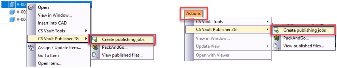 Publishing commands are displayed in the context menu by right-clicking on the selected entity or in the Actions menu.