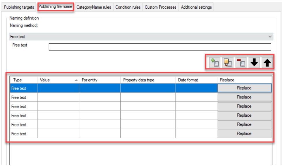 If the source entities contain characters in the selected property that should not appear in the name, is possible to define their replacement under the Replace button.