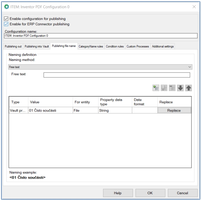 File naming can be done independently of already published data. As usual, the "Part Number" property is set as the main name of the published data in the Vault. It is used due to simple rewriting and disconnection of already published documentation when unapproved and approving CAD documentation.