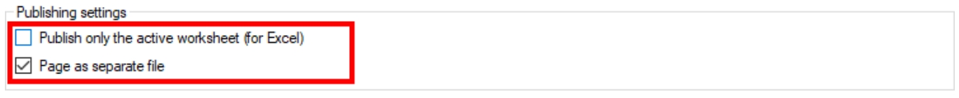 The specific setting of publishing MS Office documents to PDF applies only to Excel files and it is possible to set the restriction of publication to the current sheet, i.e. the sheet that was set as active when closing the file. With the “Page as separate file” option is possible to create for every sheet own PDF file.