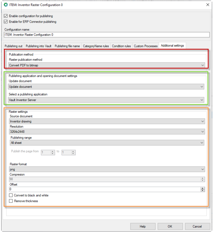 The setting for publishing an Inventor drawing to a raster are as follows: