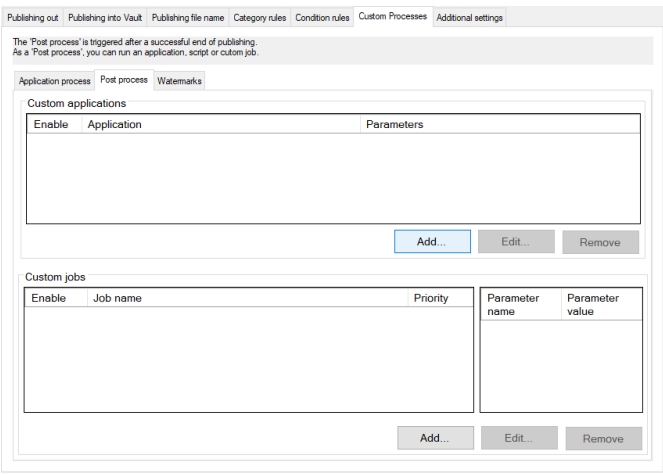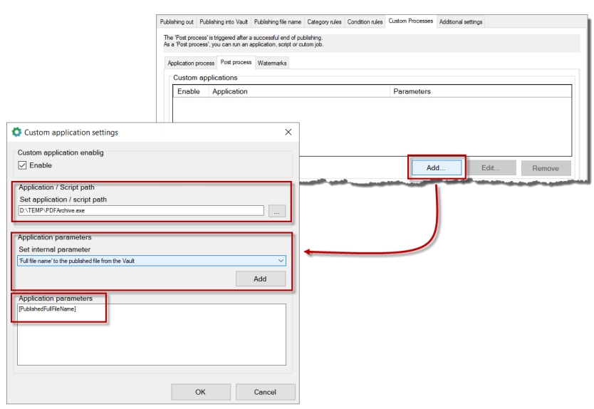 To define which application or script should be running after publishing, click Add button. In the dialog, set path and name of the application or script. If the application supports the insertion of attributes, they can be written to the Application parameters section.