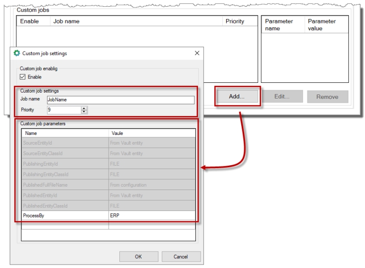 Alternatively, enter your custom task parameters with values (greyed out parameters refer to the published file and are added to the job automatically).