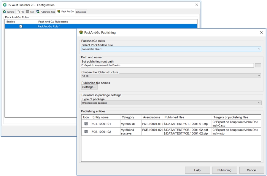 The user fills in the rule name, publication path, the naming of the published files, the file structure of the data (pre-prepared structure or the Vault structure) and whether the file will be directly assigned to the compressed * .zip folder.
