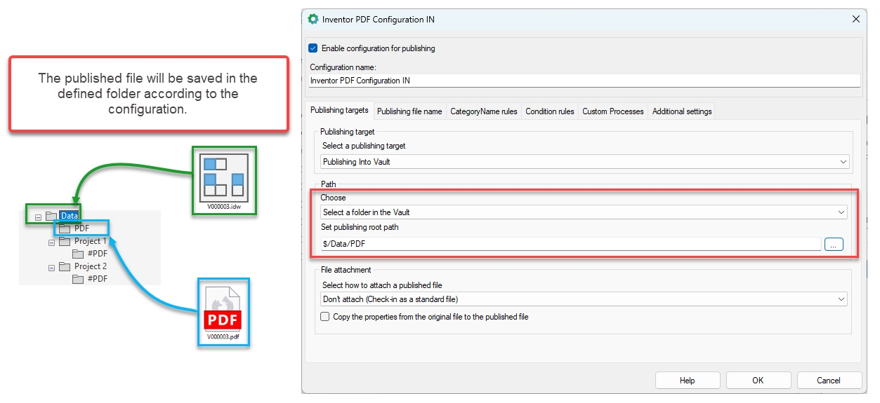 If the source file "V000003.idw" is stored in the "$/Data" folder, according to this configuration, the published file will be stored in the "$/Data/PDF/V000003.pdf" folder.