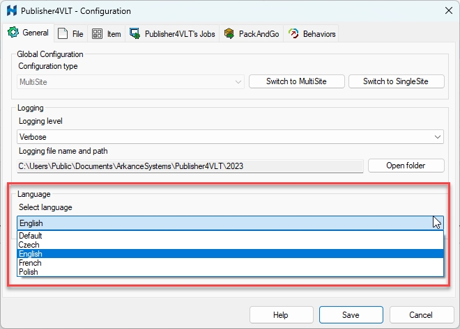 Supported language variants are automatically detected based on the language version of the Vault client. Newly added option to change this default setting and set Publisher4VLT language variant as needed.