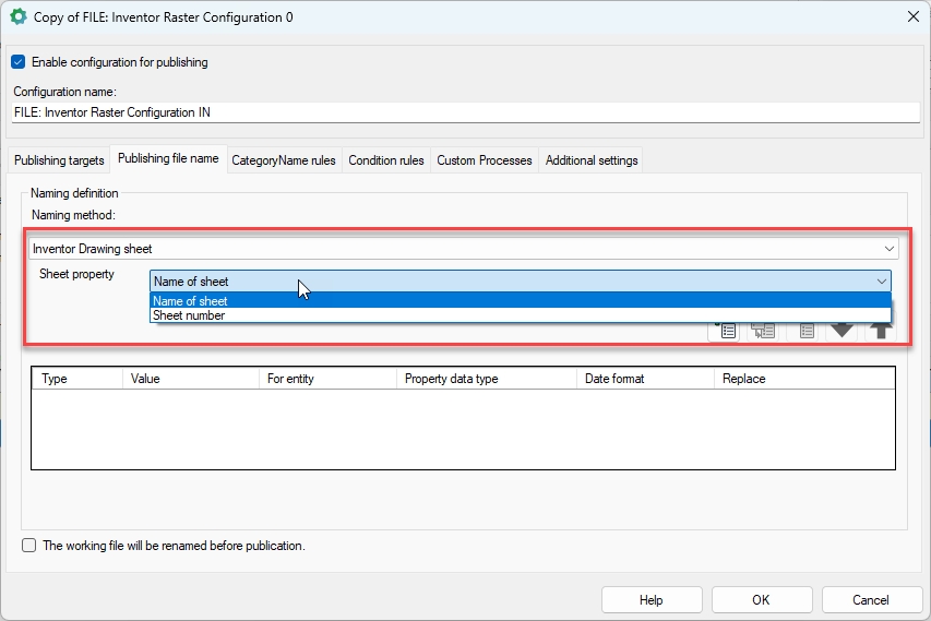 It is now possible to use the properties 'Sheet name' and 'Sheet number' to name the published file when publishing an image from a drawing using the InventorRaster module