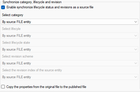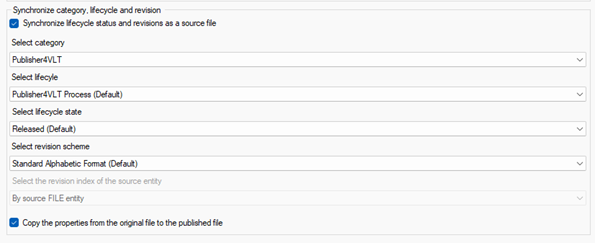 When publishing to Vault, you can now set the category, lifecycle, lifecycle state, and revision index of the published file. It is possible to choose whether the category, lifecycle, and lifecycle state are taken from the source entity...