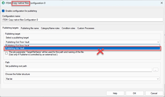 The "Publishing into Vault" option, which confused some users, has been removed from the “Copy native files” module. To copy native files inside Vault, use the Vault Copy Design feature.