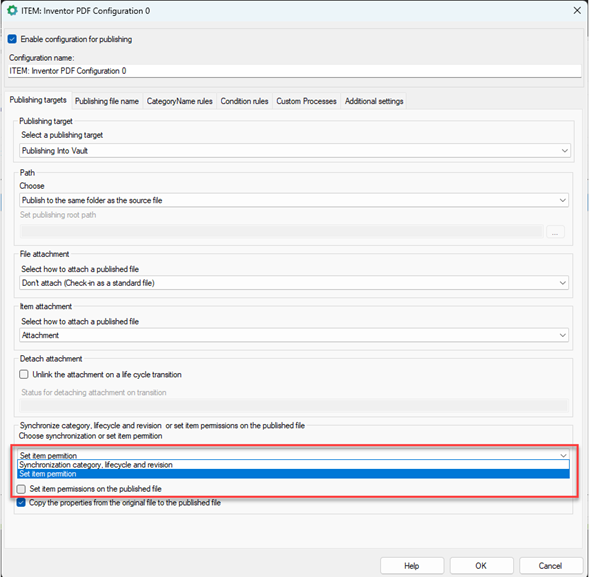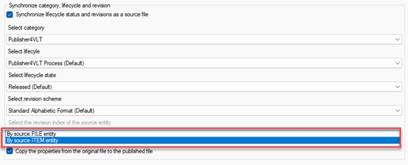 As a part of the modifications, the “Set item permissions on the published file” was moved to the “Synchronize category, lifecycle, and revision or set item permissions on the published file” section when publishing to Vault.